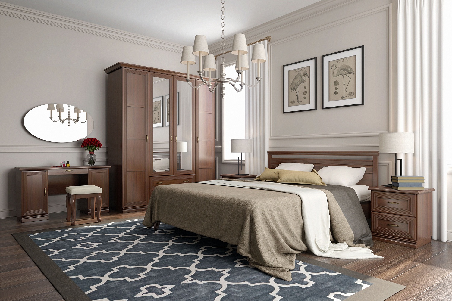 Чтобы сделать интерьер более завершенным, вы можете дополнительно приобрести аксессуары из металла и графичные постеры в базовых оттенках. Для большего удобства композицию можно завершить мягким пуфом или банкеткой в кремовых оттенках или в тон мебели. Не забудьте про туалетный столик, который сделает утренние и вечерние ритуалы еще приятнее.