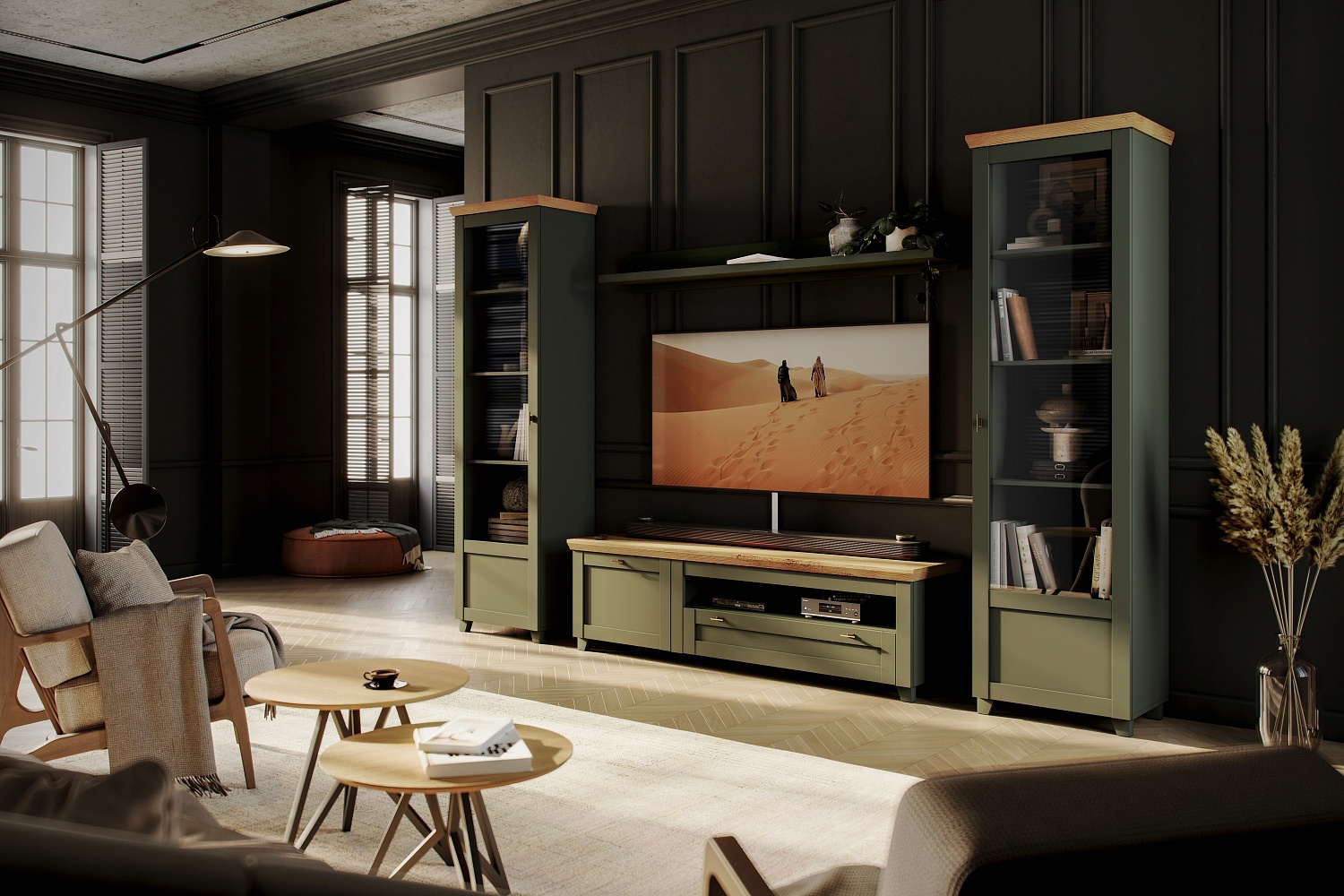 Модульная коллекция мебели Эмили, представленная возможностью создания разнообразных композиционных решений, выполнена в цвете Олива (корпус, фасады) и Таксония (крышка).