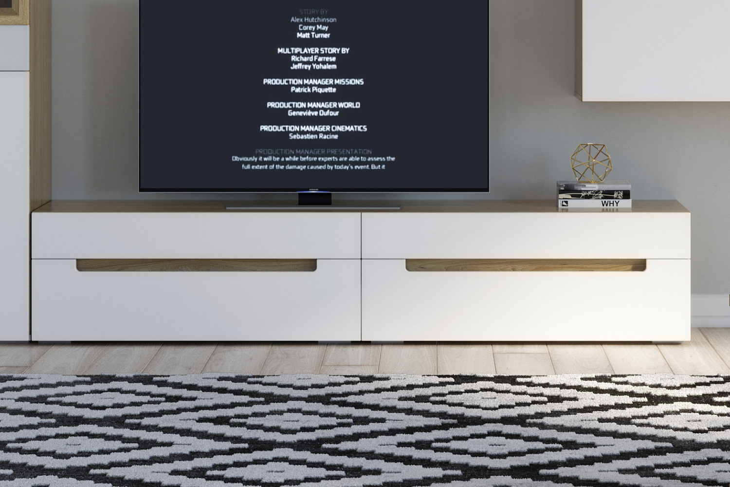 – описание: стиль современный, минимализм, цвет швейцарский вяз, белый, размер 37.2x180.2x41.3 см, назначение под тв.