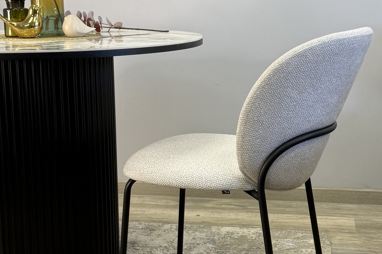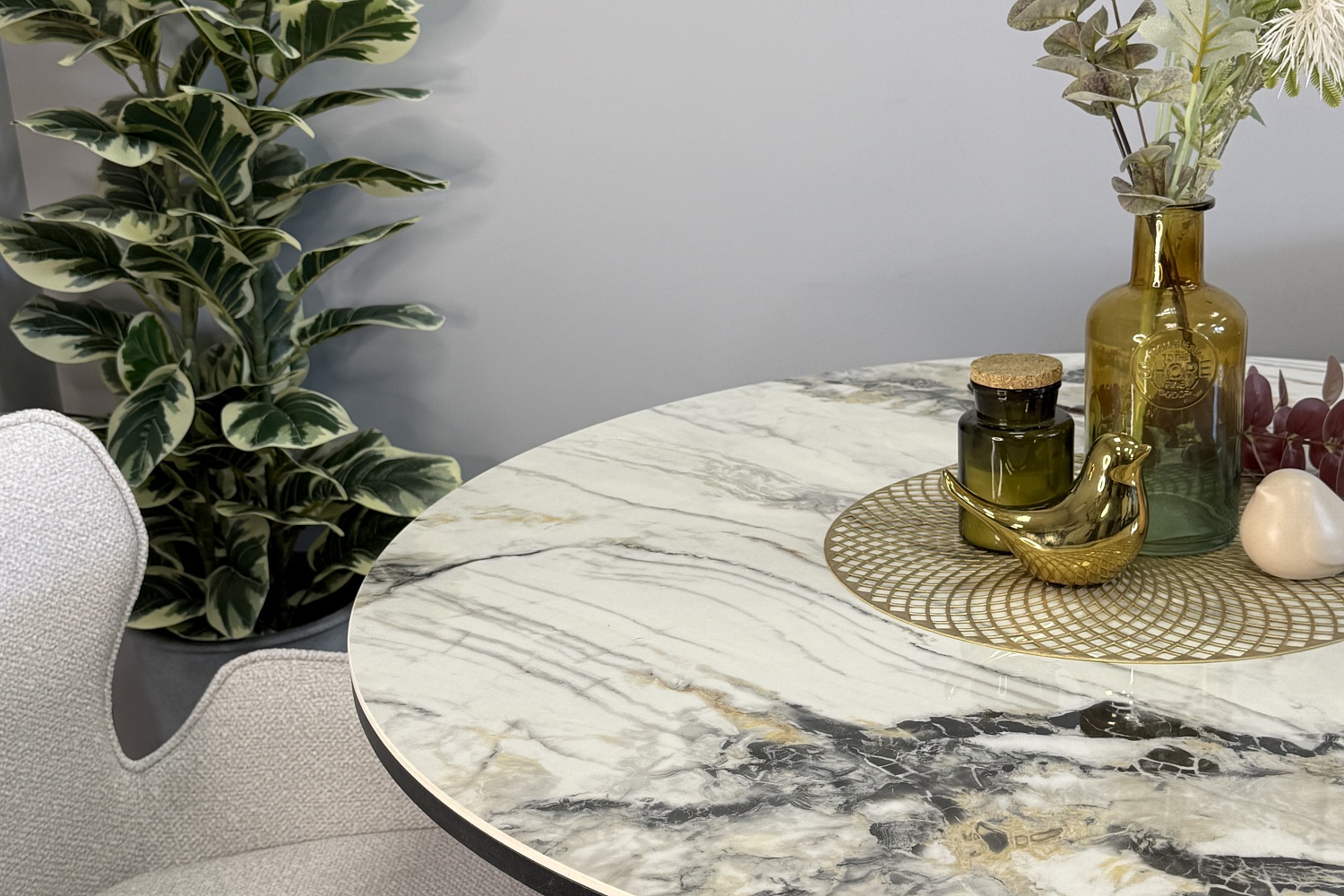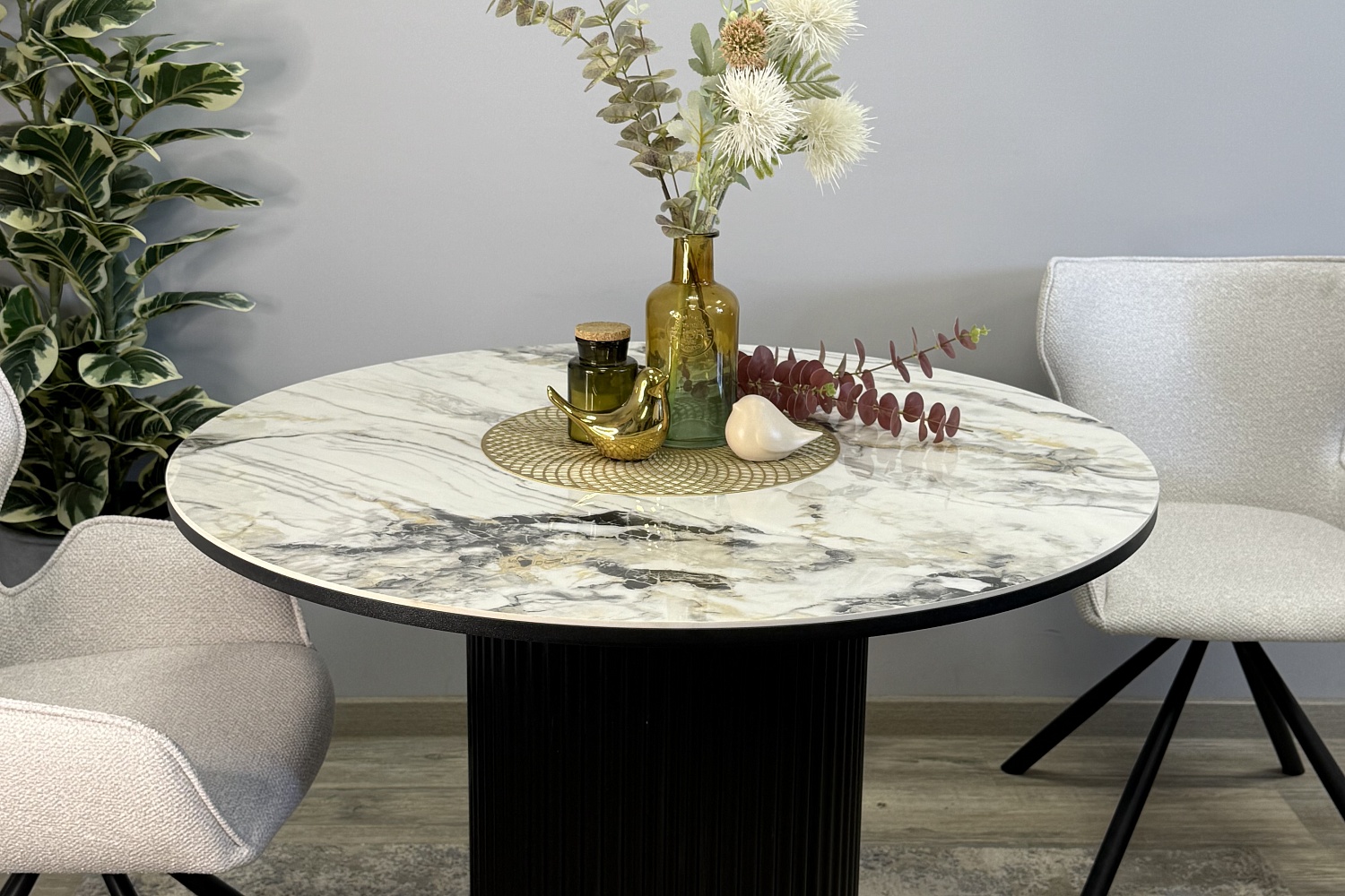 Глянцевая керамическая столешница очень привлекательна, благодаря современному дизайну и яркому оформлению. Удобное расположение коленей обеспечивает комфорт при использовании изделия. Размер обеденного стола идеально подходит для четырех персон.