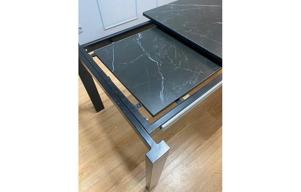 В сложенном же виде, с широкой стороны стола остаётся место даже для двух крупных кресел, благодаря расположению ножек. Раздвижной механизм обеспечивает комфорт при эксплуатации. Вмещает до четырех стульев с обеих сторон.