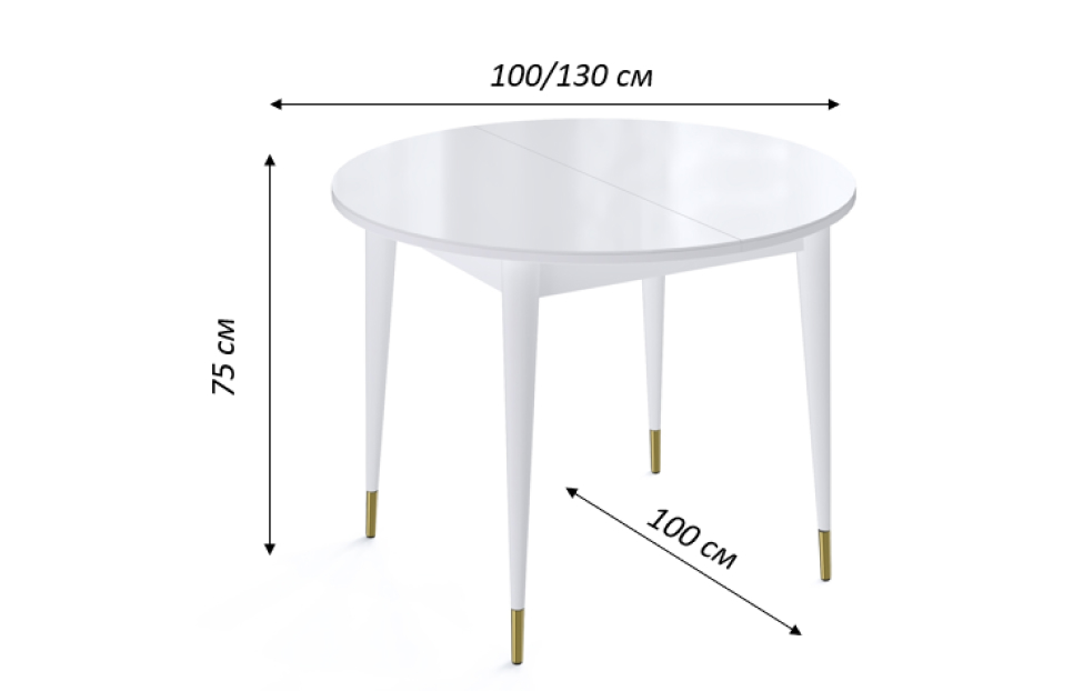 Стол обеденный Мане круглый раздвижной К1000 опоры белые с металлическими наконечниками, столешница - стекло белое глянец.