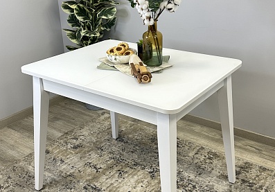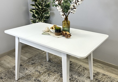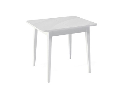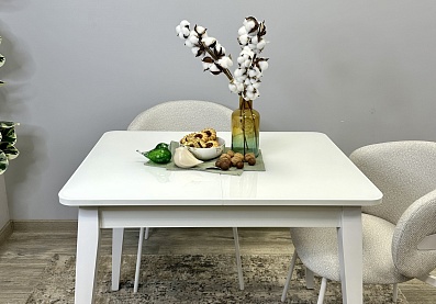 Стол обеденный Мане прямоугольный раздвижной К1100 опоры белого цвета с металлическими наконечниками, столешница - стекло белое сатин.