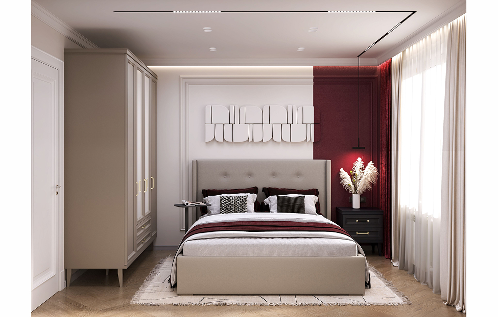 - Детали кровати обтянуты тканью Avelina (9534), изголовье декорировано пуговицами;