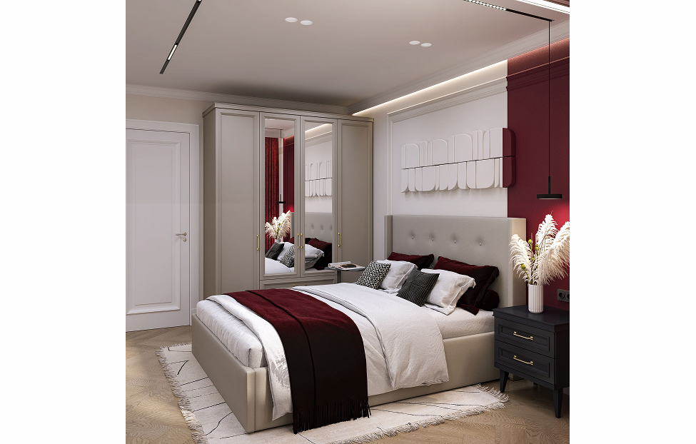 - Шкаф 4-створчатый с центральными зеркальными фасадами, 2 боковыми глухими фасадами и 2 выдвижными ящиками;